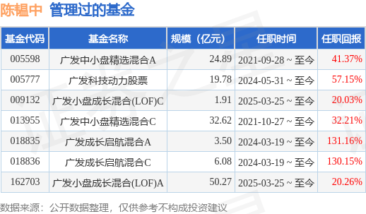 重仓股战绩回顾:其管理的广发中小盘精选混合A在2024年第三季度调入寒武纪,调入当季均价233.11,连续持有2个季度后,在2025年第一季度调出,调出当季均价681.59,估算收益率为192.39%(估算收益率按后复权的调入调出季度均价算出)。