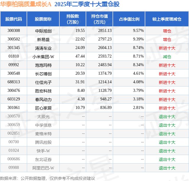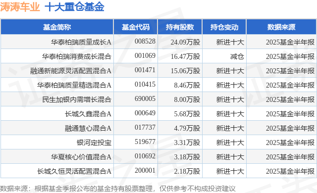 根据2025基金半年报公募基金重仓股数据,重仓该股的公募基金共14家,其中持有数量最多的公募基金为华泰柏瑞基金的华泰柏瑞质量成长A。华泰柏瑞质量成长A目前规模为2.96亿元,最新净值1.3618(10月14日),较上一交易日下跌5.62%,近一年上涨61.52%。该公募基金现任基金经理为陈文凯。陈文凯在任的基金产品包括:华泰柏瑞质量精选混合A,管理时间为2023年8月1日至今,期间收益率为62.39%;