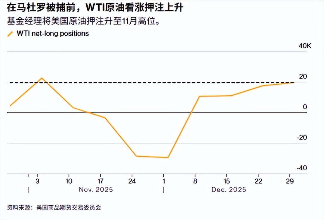 而其实在马杜罗被捕前,对冲基金加大了对石油的看涨押注。美国商品期货交易委员会(CFTC)的数据显示,截至12月30日当周,基金经理对美国基准原油的净多头头寸增加了2045手,达到19711手,创两个月来最大增幅。洲际交易所欧洲期货交易所的数据显示,对冲基金对布伦特原油的多头头寸升至四周以来的最高水平,因为当时的市场正在权衡有关南美国家即将遭受陆地袭击的猜测。