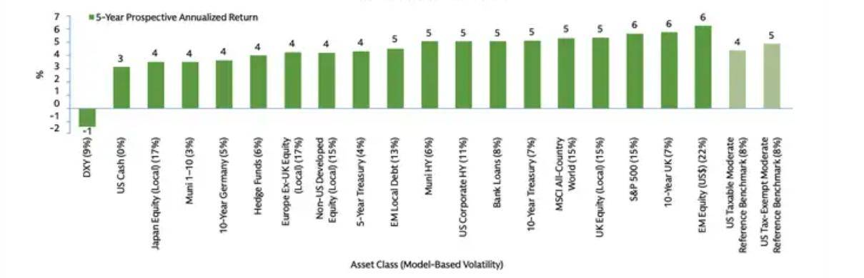 英国股票和MSCI全球所有国家指数在未来5年的预期收益率分别位居第三和第四,平均收益率为5%。