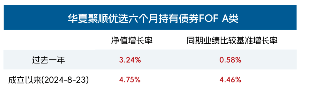 华夏聚顺优选六个月持有A成立于2024.08.23,成立以来完整会计年度业绩/同期业绩基准表现为:2025年3.24%/0.58%,自基金合同生效起至今4.75%/4.46%,截至2025.12.31。业绩比较基准为:中债综合指数收益率*90%+中证800指数收益率*10%。