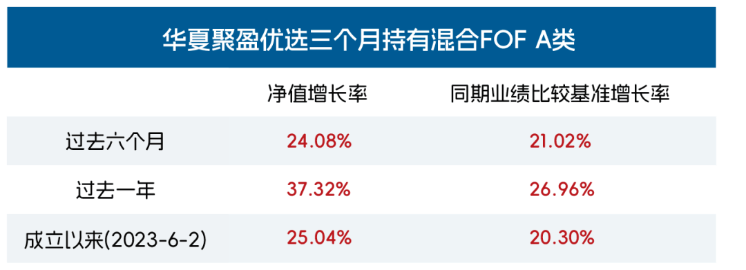 以混合型FOF——华夏聚盈优选3个月FOF(A类:018302 / C类:018303)为例,截至2025年12月31日,近半年净值增长率达到24.08%(同期业绩比较基准21.02%),过去一年净值增长率达到37.32%(同期业绩比较基准26.96%),超越业绩基准10.36个百分点。