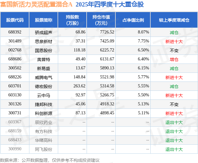根据2025基金年报公募基金重仓股数据,重仓该股的公募基金共6家,其中持有数量最多的公募基金为富国基金的富国新活力灵活配置混合A。富国新活力灵活配置混合A目前规模为3.91亿元,最新净值3.2625(4月3日),较上一交易日上涨0.08%,近一年上涨22.55%。该公募基金现任基金经理为吴栋栋。吴栋栋在任的基金产品包括:富国质量成长6个月持有混合A,管理时间为2022年2月28日至今,期间收益率为38.97%;富国核心优势混合发起式A,管理时间为2023年12月1日至今,期间收益率为72.2%;富国核心动力混合A,管理时间为2026年3月18日至今,期间收益率为-2.1%。
