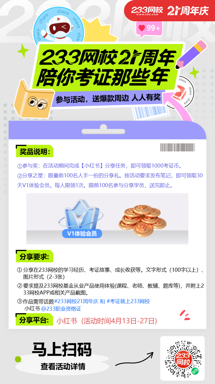 凡是233网校学员,在活动期间完成以下【小红书】分享任务,即可领取1000考证币(4.28统一发放),分享前100名送30天V1题库体验会员,科目任选。
