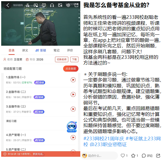 比如 “必须好好夸夸 233 网校的基金课程和题库!233 网校的王佳荣老师讲课特别容易理解,先让你理解,在教你怎么记忆,通俗易懂,复杂的理论知识,老师都能拆分成通俗的例子讲解;题库也特别全面,章节练习、模拟试卷、历年真题、考前点题应有尽有,帮我节省了大量找题的时间。靠着 233 网校的帮助,我一次性就通过了基金从业资格两科考试,这份信任,来自 233 网校多年积累的专业实力!”⭐