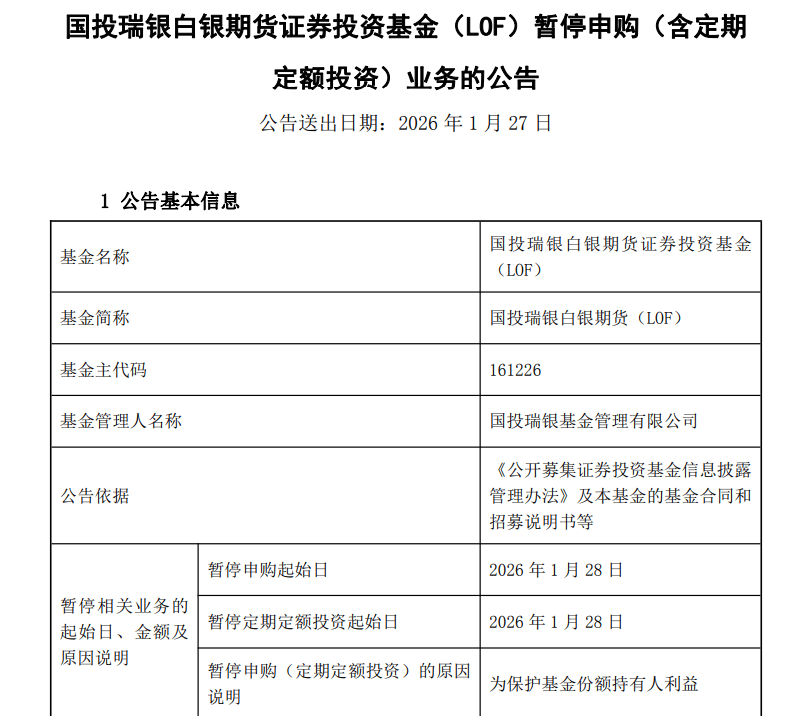 188金宝博,金宝博官方网站,金宝博APP下载1月26日晚间,国投瑞银基金发布公告称,为保护基金份额持有人利益,国投瑞银白银LOF(下称“国投白银LOF”)将于1月28日起暂停申购(含定期定额投资)业务。这也意味着,这一公募市场唯一主要投资白银期货的LOF产品将暂时对新增资金关上大门。